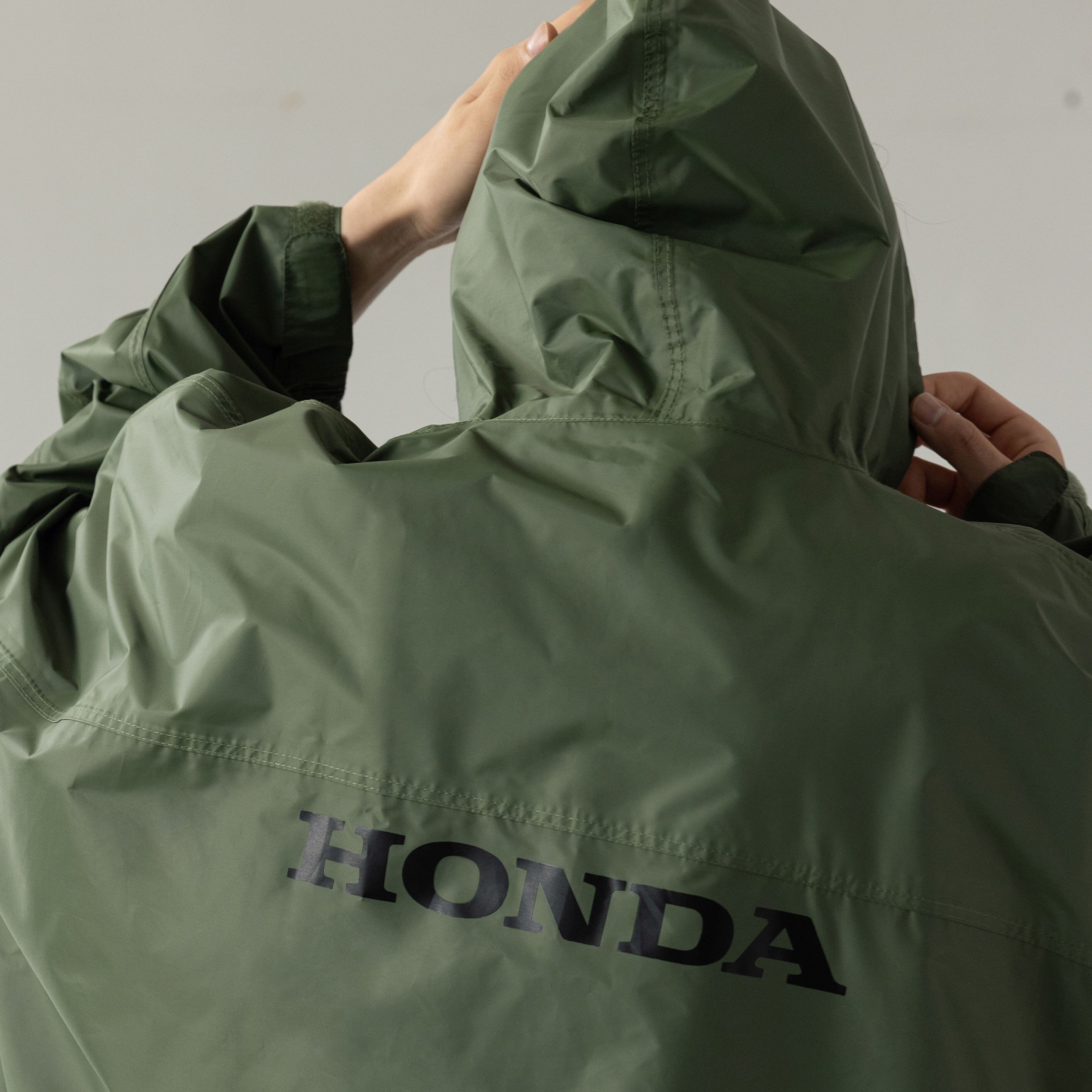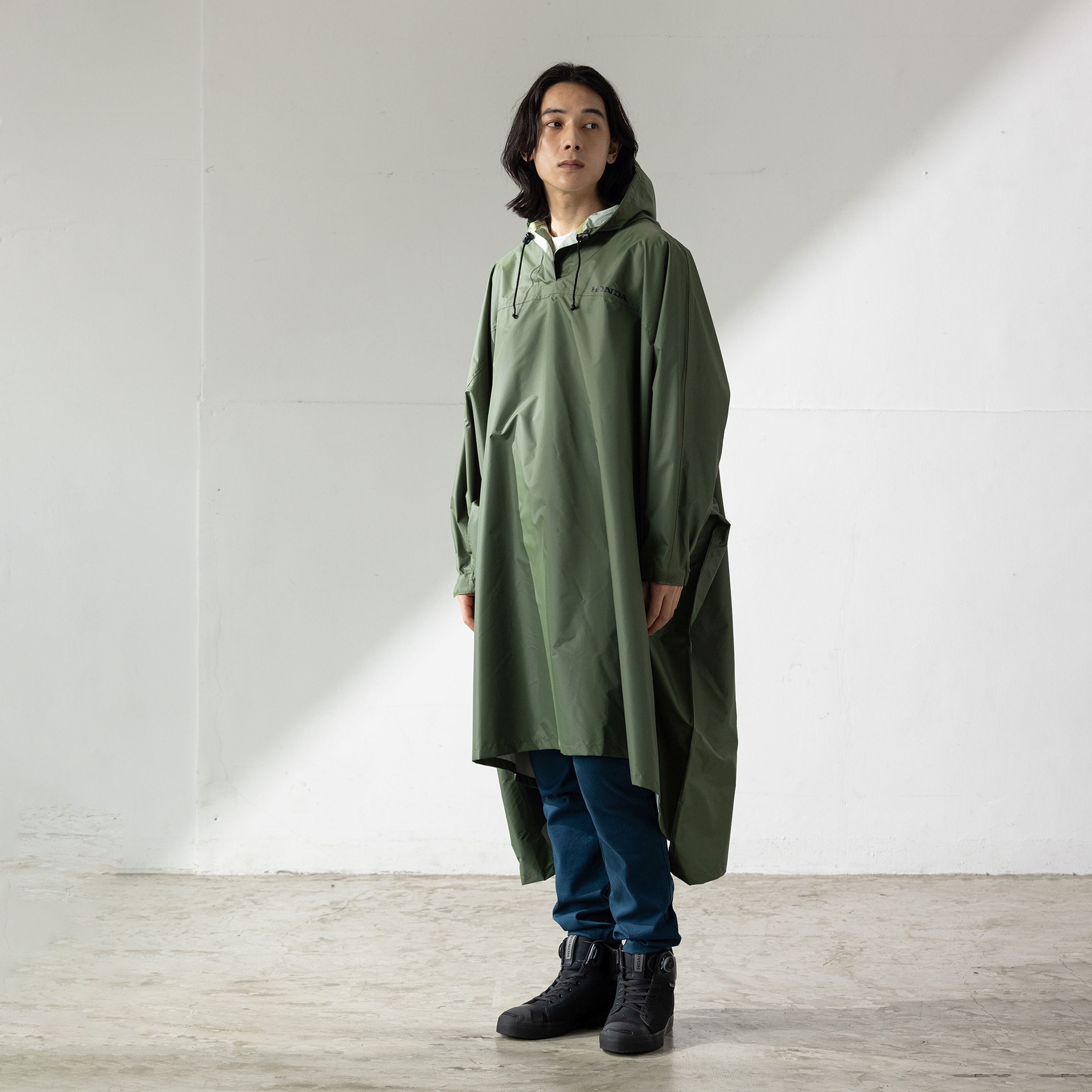 レース観戦時におススメのレッド、アウトドアやレジャーでも使いやすいカーキ、ベージュの3色展開。防水・防風仕様のポンチョ。袖が独立しているので脇からの雨もガードし、袖口にはアジャスターを装備。持ち運びに便利な収納ポーチ付き。背中にも余裕があるため、リュックを背負ったままでも着脱が可能。